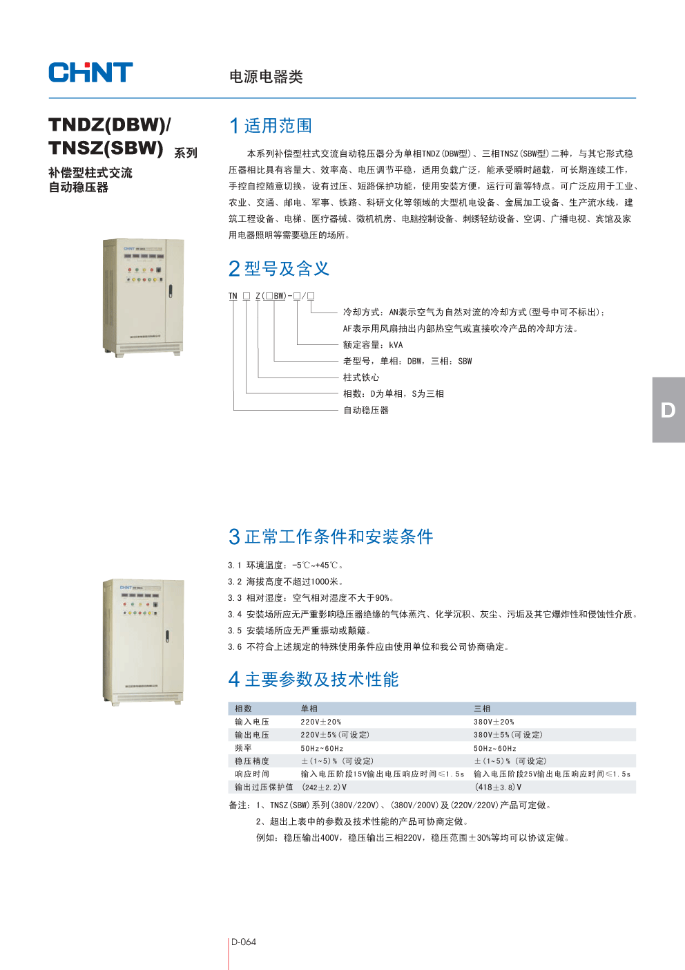分为单相TNDZ(DBW型)、三相TNSZ(SBW型)二种,与其它形式稳压器相比具有容量大、效率高、无波形畸变、电压调节平稳,适用负载广泛,能承受瞬时超载,可长期连续工作,手控自控随意切换,设有过压、短路、相序保护功能等,使用安装方便,运行可靠等特点。可广泛应用于工业、农业、交通、邮电、军事、铁路、科研文化等领域的大型机电设备、金属加工设备、生产流水线,建筑工程设备、电梯、医疗器械、微机机房、电脑控制设备、刺绣轻纺设备、空调、广播电视、宾馆及家用电器照明等需要稳压的场所